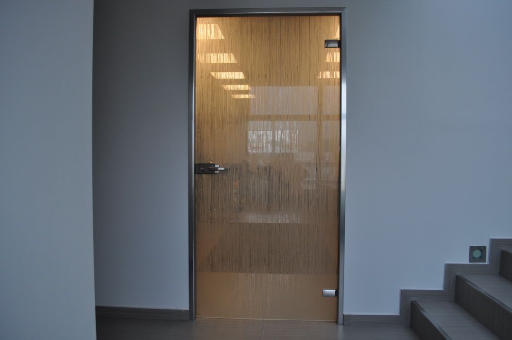 Противопожарная безрамная дверь со стеклом в БЦ в Химках