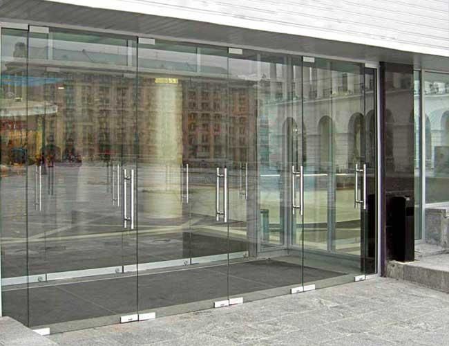 Противопожарная безрамная дверь со стеклом в торговый центр в Химках