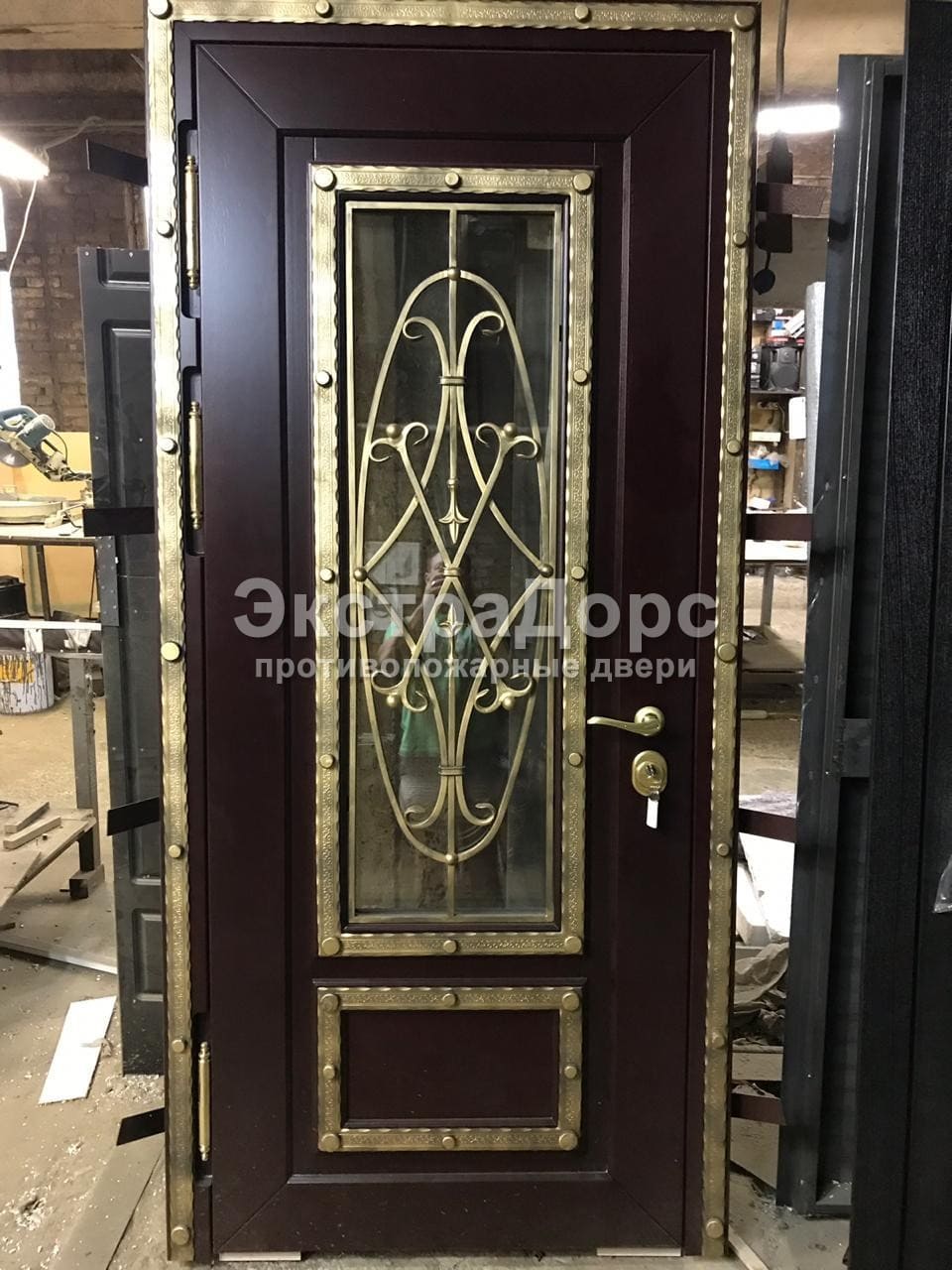 Противопожарная остекленная дверь с отделкой МДФ и ковкой в Химках